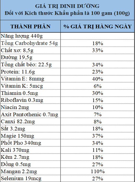 Để có thể giúp bạn hiểu rõ hơn về những lợi ích của việc sử dụng loại ngũ cốc này, mời bạn cùng tham khảo chi tiết bảng thành phần các chất dinh dưỡng có trong 100gram ngũ cốc Granola như sau: